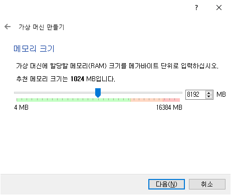 가상머신에서 사용할 메모리(RAM) 설정 입니다. 회사에서는 PC RAM 사이즈의 절반 정도로 잡아요.