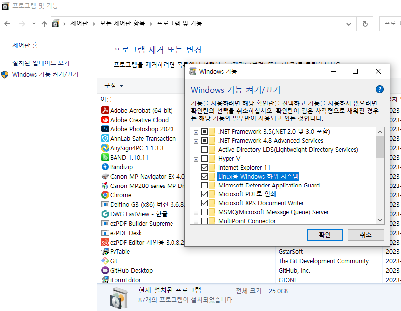 제어판 > 프로그램 및 기능 > Windows 기능 켜기/끄기 > Linux용 Windows 하위 시스템 선택