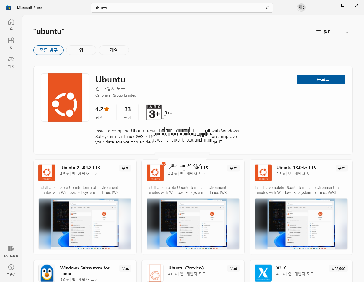 Microsoft Store에서 ubuntu 라고 검색하면 아래처럼 앱 하나가 나옵니다.