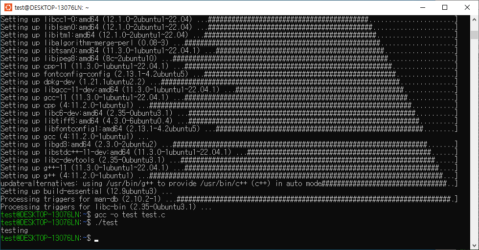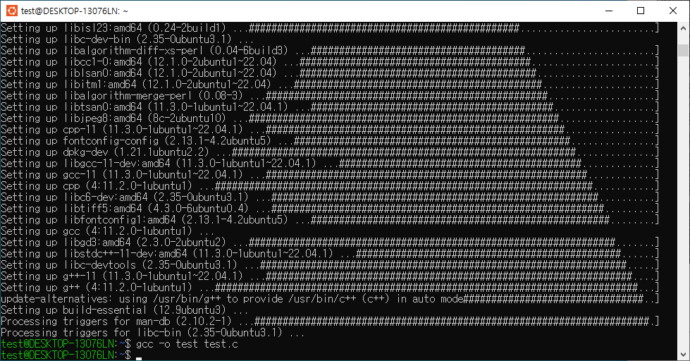 CLI 화면에서 gcc -o test test.c 라고 치면 test 라는 실행파일이 생깁니다.