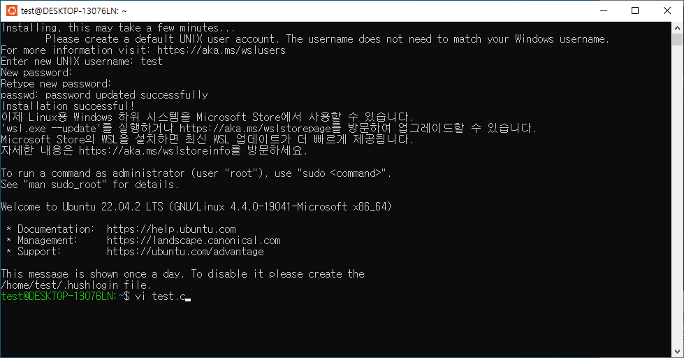 "vi test.c" 라고 치고 엔터를 누릅니다.
