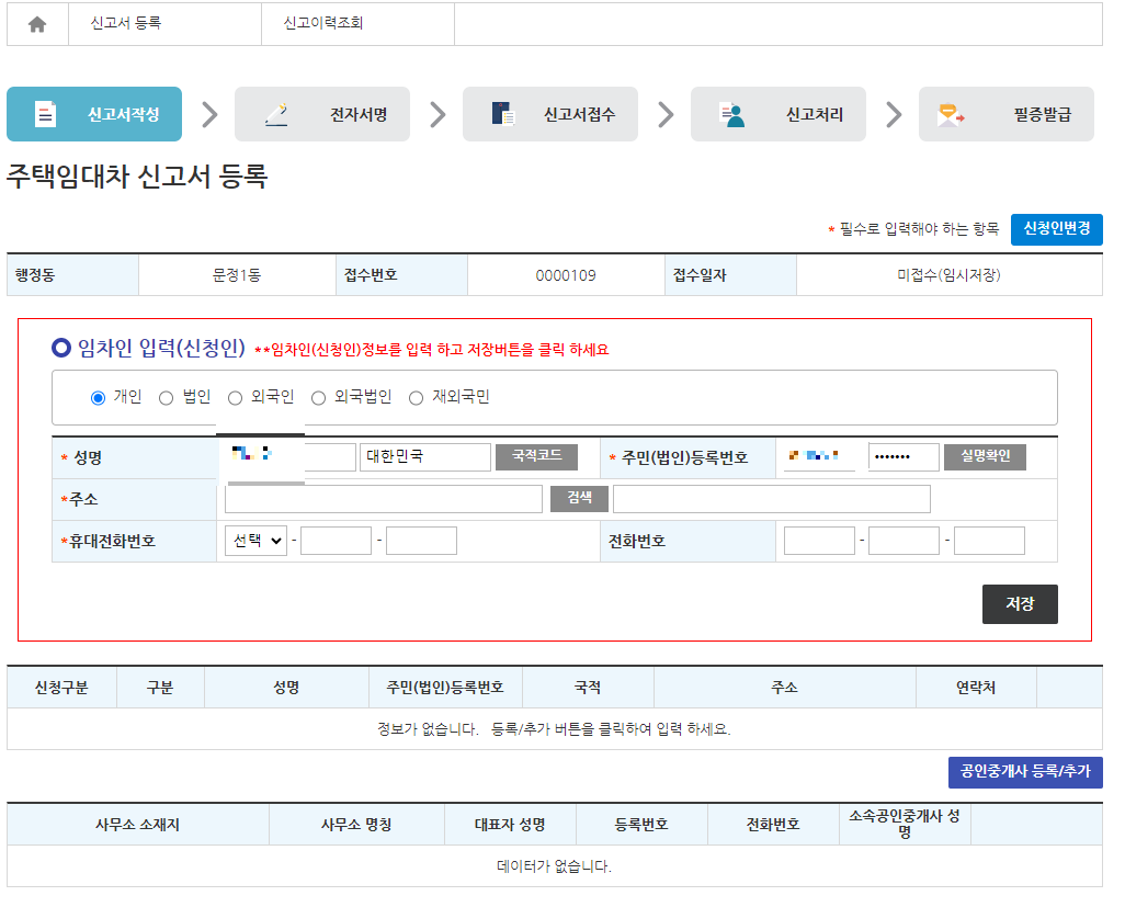 그리고 주소 밑에 임차인, 임대인, 대리인 구분을 잘 선택해 주시고요!