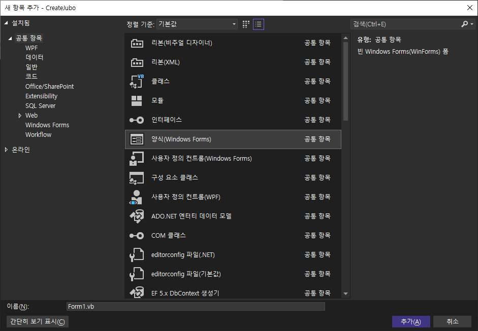 프로젝트 우측 클릭 > 추가 > 새 항목 > 양식(Windows Forms) 추가