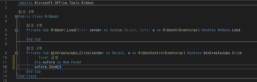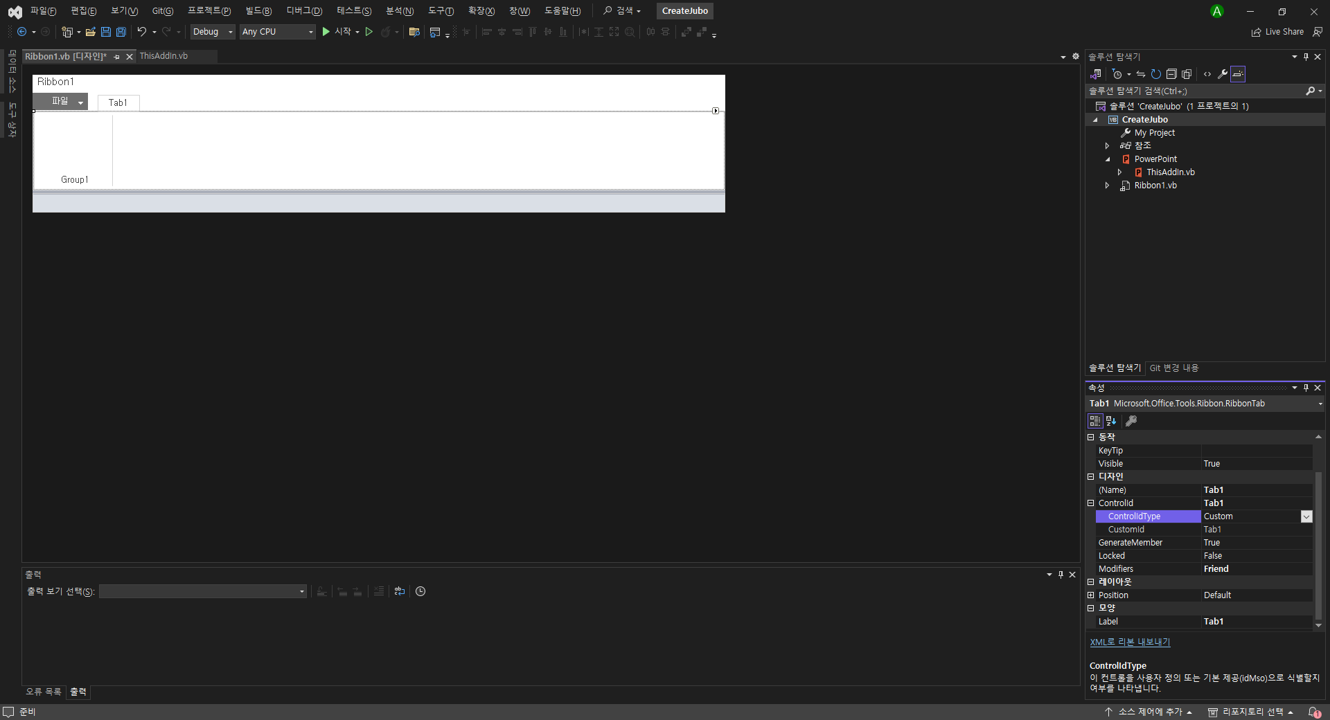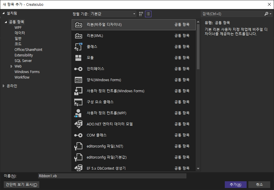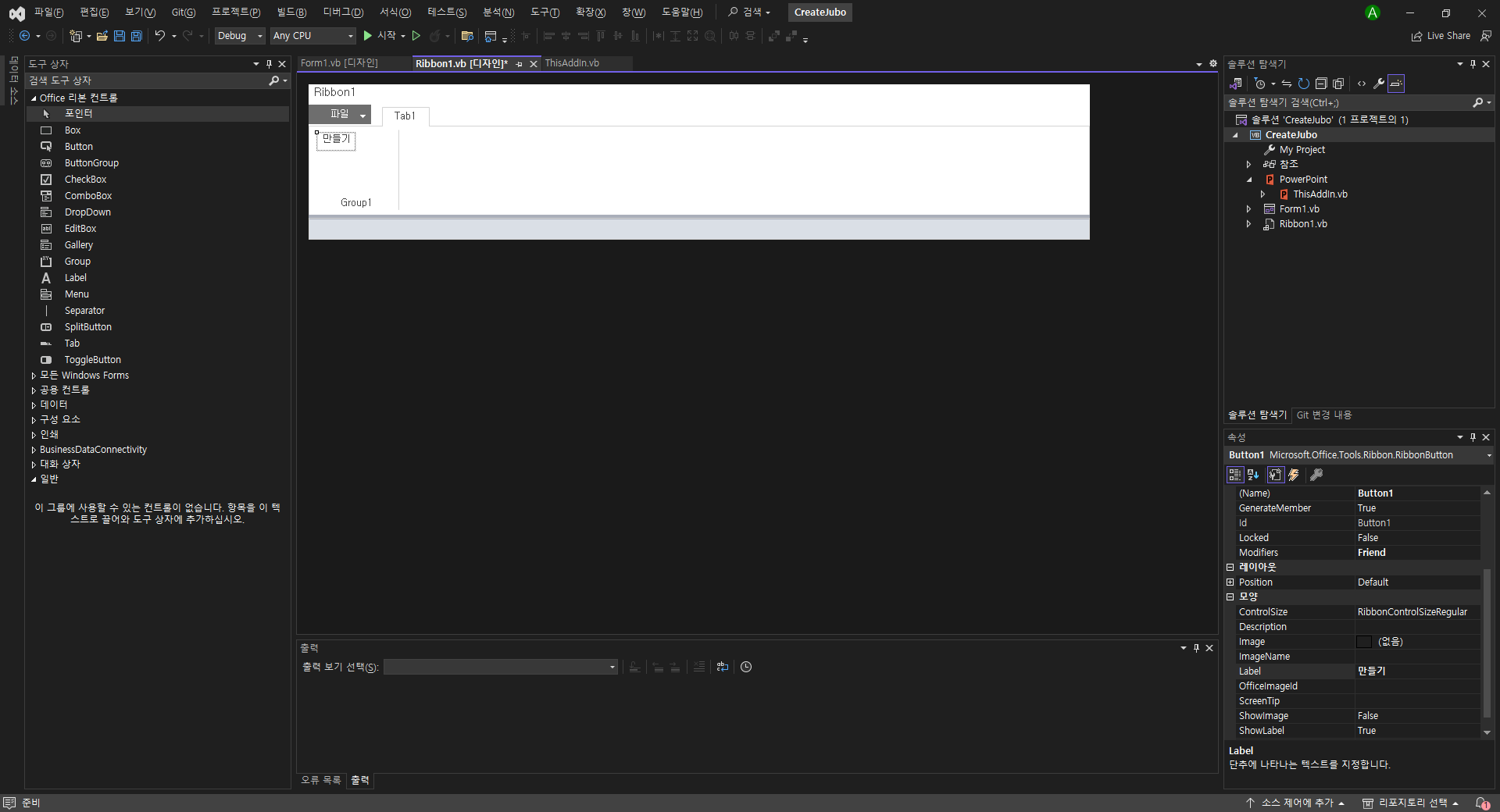 Ribbon1.vb [디자인] 에서 버튼 도구 추가