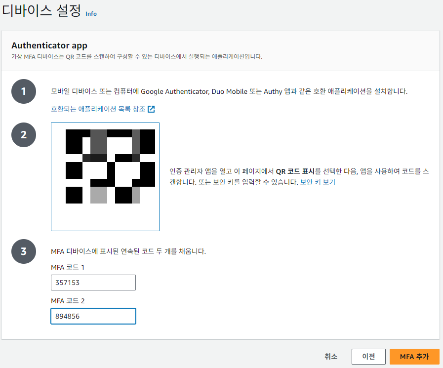 처음에 뜨는 6자리 코드를 MFA 코드 1에 넣는다.