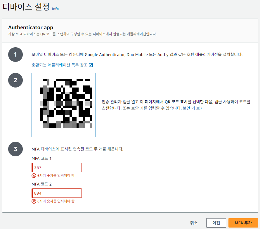 MFA 추가할 때는 6자리 숫자 입력하라는 메시지도 안나왔다 ㅡㅡ